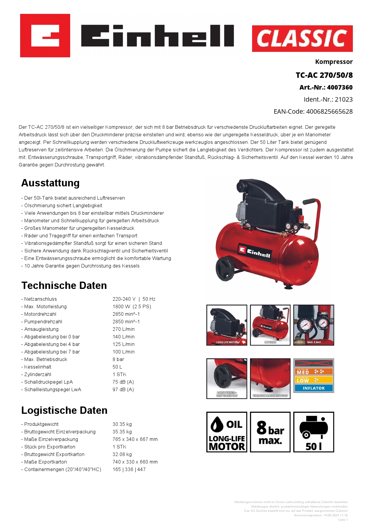 Der TC-AC 270/50/8 ist ein vielseitiger Kompressor, der sich mit 8 bar Betriebsdruck perfekt für verschiedenste Druckluftarbeiten eignet. Der geregelte Arbeitsdruck lässt sich über den Druckminderer präzise einstellen und wird über das große Manometer angezeigt. Auch der ungeregelte Kesseldruck lässt sich auf einem Manometer ablesen. Per Schnellkupplung können schnell und werkzeuglos verschiedene Druckluftwerkzeuge angeschlossen werden. Dabei bietet der 50 Liter Tank genügend Luftreserven, um auch zeitintensive und ausdauernde Arbeiten problemlos zu bewältigen. Die Ölschmierung der Pumpe sichert dabei stets die Langlebigkeit des Verdichters. Ein Rückschlag- und Sicherheitsventil sorgen für die nötige Sicherheit während des Betriebs. Das kondensierte Wasser kann per Entwässerungsschraube unkompliziert und sauber aus dem Kessel abgelassen werden. Der vibrationsdämpfende Standfuß vermeidet Erschütterungen, sorgt für einen sicheren Stand und reduziert die Geräuschentwicklung. Schnell einsatzbereit und einfach zu transportieren ist der Kompressor dank des praktischen Transportgriffs und der zwei gummierten Räder. Auf den solide verarbeiteten Kessel werden 10 Jahre Garantie gegen Durchrostung gewährt.