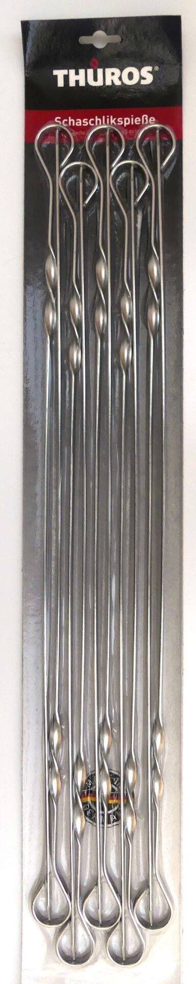 Die Schaschlikspieße von Thüros bestehen aus rostfreiem Edelstahl und sind stufenlos dreh- und fixierbar. Die Spieße sind einseitig verdrillt.