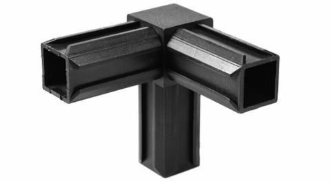Für die Verbindung von Vierkantrohren aus Aluminium, z.B. für den Bau von Regalen, Tischen etc. mit einem weiteren rechtwinkeligen Abgang